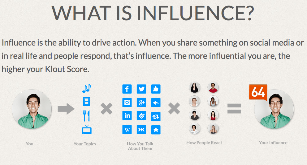 “La influencia es la habilidad de llevar a la acción. Cuando compartes algo en Redes Sociales o en la vida real y la gente responde, eso es influencia. Entre más influyente seas, mayor será tu score de Klout”.